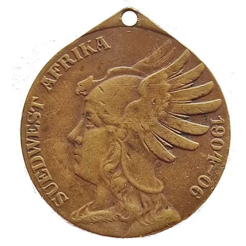 Germania with a winged helmet looking to the left. On the left edge the Gogen-shaped writing - SUEDWEST AFRIKA -. On the right edge, a little below, the arched writing - 1904-06 -. Lower in the neck section small - SCHULTZ -. |