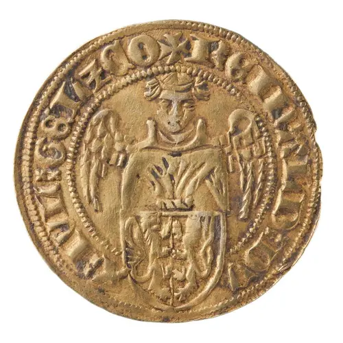 | Opis awersu | Three-quarter length angel facing, behind Guelders-Julich arms. |