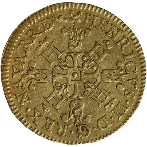 HENRICVS II D G REX NAVARR DB (Translation: Henry II, by God`s grace, king of Navarre and lord of Bearn.) |