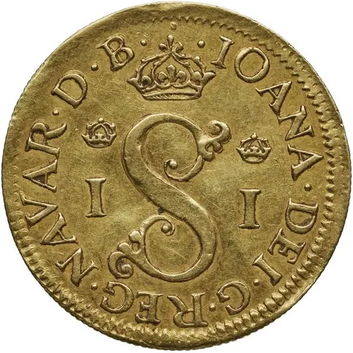 IOANA DEI G REG NAVAR D B (Translation: Joan, by the grace of god, queen of Navarra and lady of Bearn.) |
