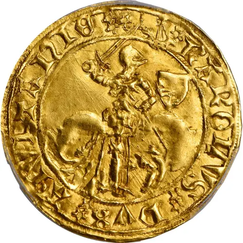 | Obverse description | Duke in full armor charges right on warhorse, wielding sword and shield bearing the devices of France and Aquitaine. |