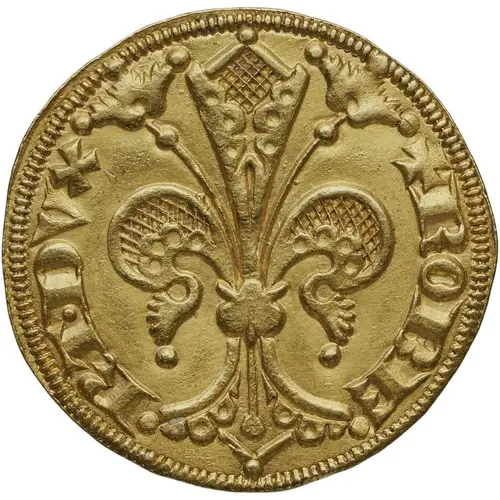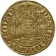 Reverse description Crowned half-bust holding sword and scepter under gothic dais.