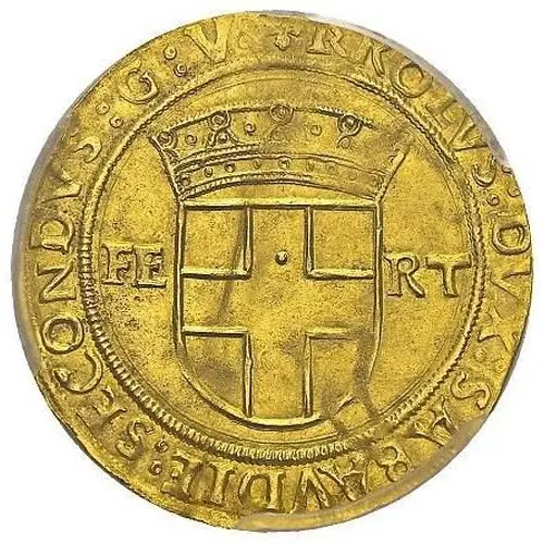 ✣ KROLVS : DVX : SABAVDIE : SECONDVS : G : V FERT (Translation: Charles II, Duke of Savoy.) |