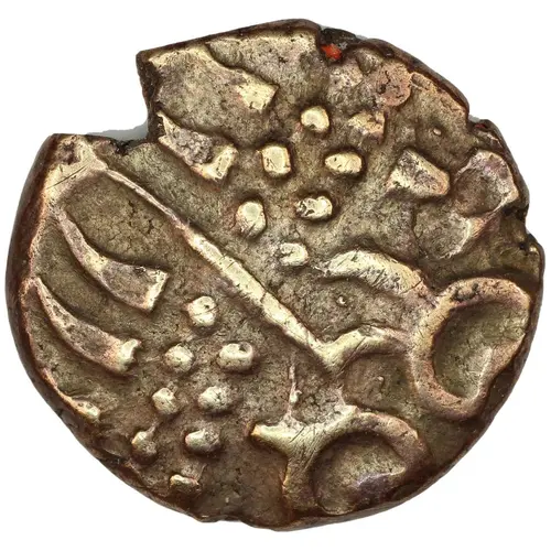 | Descripción del reverso | Wolf left, jaws open, bird on back. Pellets above. Pellet and solid crescent below. |