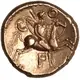 | Arka yüz açıklaması | Warrior holding spear and shield on horse right. Horse stands on incomplete `boxes`. Inscription behind rider, above horse`s head and below horse. Pellet border. |