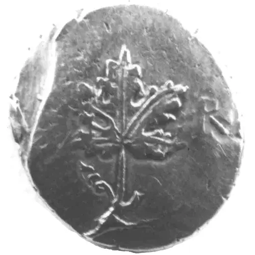 | Popis líce | Vine leaf. Short angled line at base of stem (with the bottom to the left), with tendril and two chevrons off it (often missing). Inscription to left and right. |