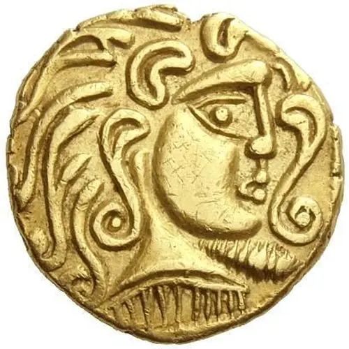 | Obverse description | Stylized head of Apollo right, with vertical lines under the neck. |