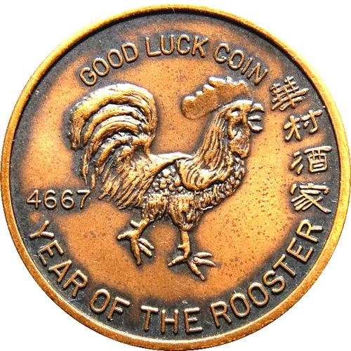 GOOD LUCK COIN 華村酒家 4667 YEAR OF THE ROOSTER (Translation: 華村酒家: Chinese Village Restaurant) |