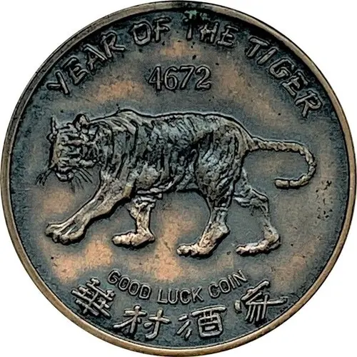YEAR OF THE TIGER 4672 GOOD LUCK COIN 華村酒家 (Translation: 華村酒家: Chinese Village Restaurant) |