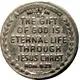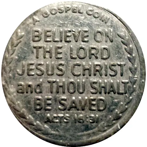| Obverse lettering | A GOSPEL COIN BELIEVE ON THE LORD JESUS CHRIST and THOU SHALT BE SAVED ACTS 16:31 |