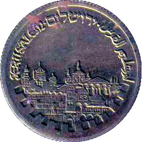 Jerusalem sites which are sacred to the three monotheistic faiths: Judaism, Christianity and Islam. On the rim, the word `Jerusalem` in Hebrew, Arabic and English. |