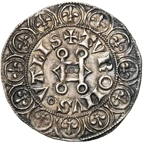 H monogram of Hainaut with features similar to the chatel of the French gros tournois. A border of 12 fleur-de-lis inside circles |