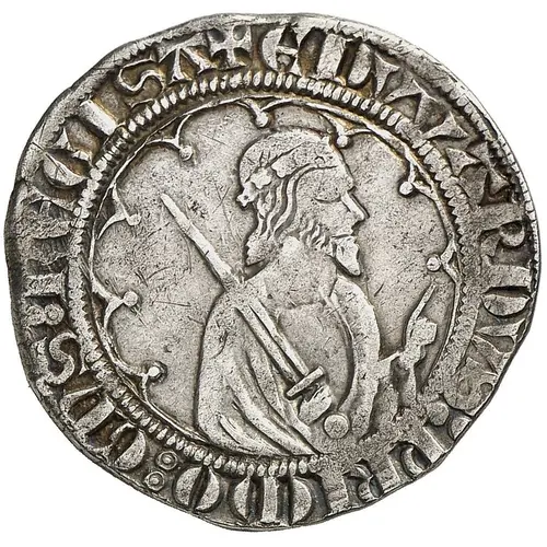 | Description de l’avers | Half-length figure of Edward right, holding sword over right shoulder and raising left hand, within tressure of arches. |