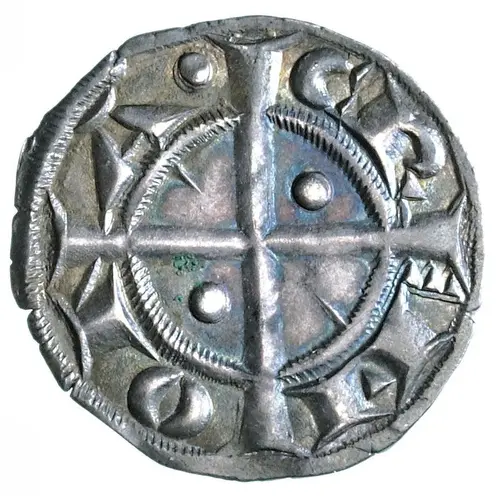 | Reverse description | Gothic letter f flanked by pellet on each side, and with spike at 10:00, within inner reeded circle. |