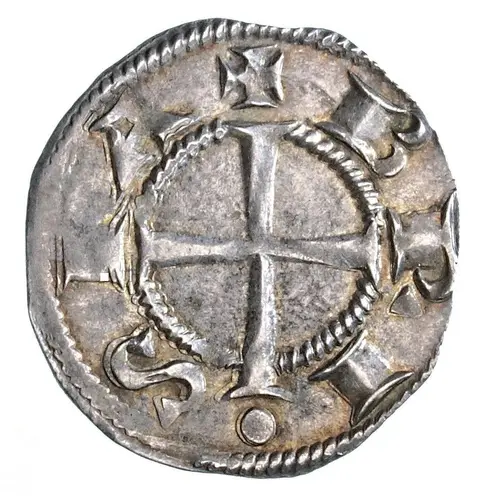 | Reverse description | Short cross pattée, top dividing reeded inner circle |