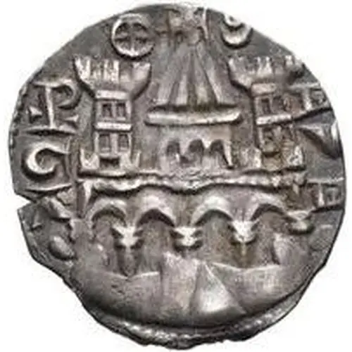 | Obverse description | Church with two crennelated towers flanking central steeple, above four arches. O with circumscribed cross to left of steeple, crescent and ring to right. Legend from left. |