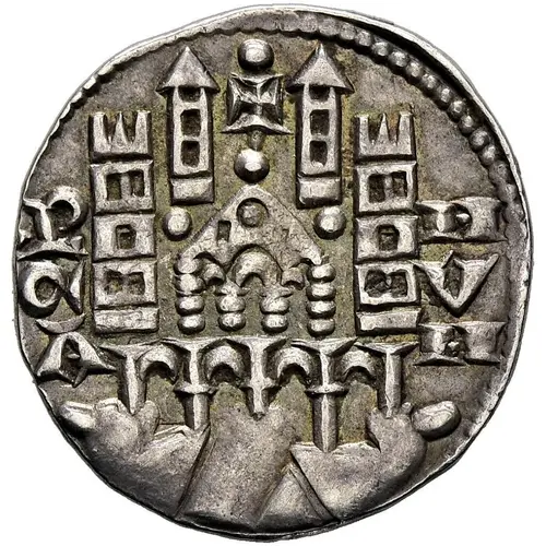 | Obverse description | Church with four towers on rocks. Legend from left. |