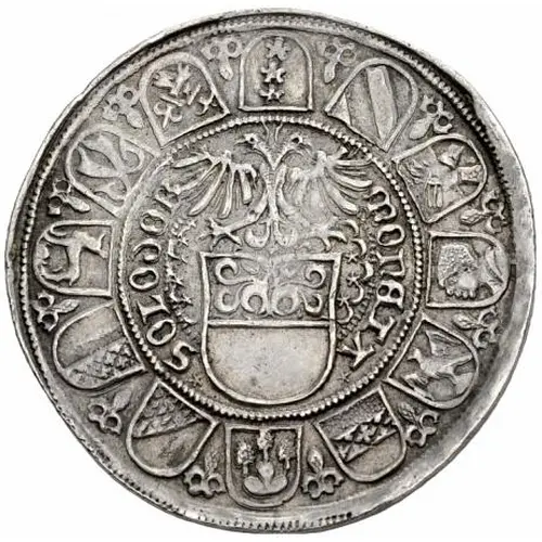 | 表面の説明 | Double-headed eagle above arms of Solothurn within circle, surrounded by twelve smaller shields. |