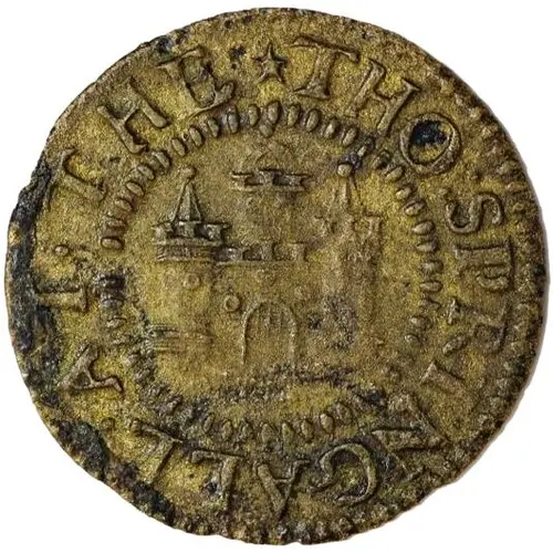 | توضیحات روی توکن | Lettering around a beaded circle, within the depiction of a castle comprising a gateway with portcullis supported by two towers with conical caps and a similar central tower. |