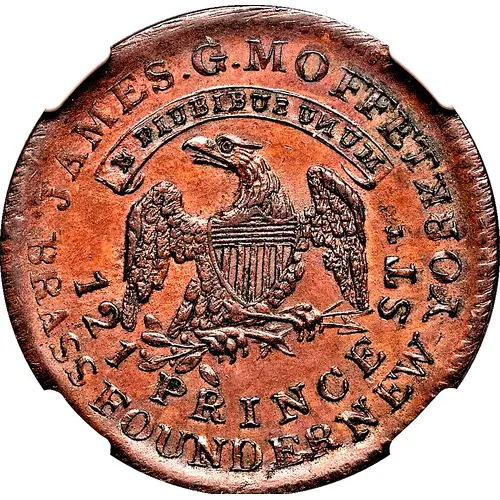 | Obverse lettering | JAMES.G.MOFFET BRASS FOUNDER - NEW YORK H PLUBIBUƧ UИUM 121 PRINCE STт |