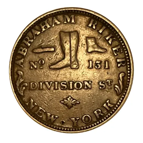 | Legenda do anverso | ABRAHAM RIKER / NO 131 / DIVISION ST / NEW YORK |