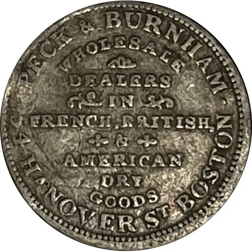PECK & BURNHAM 54 HANOVER ST. BOSTON WHOLESALE DEALERS IN FRENCH, BRITISH, & AMERICAN DRY GOODS |