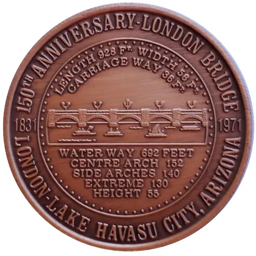 | Obverse lettering | 150TH ANNIVERSARY-LONDON BRIDGE LENGTH 928 Ft. WIDTH 56 Ft. CARRIAGE WAY 36 Ft. 1831 1971 WATER WAY 692 FEET CENTRE ARCH 152 SIDE ARCHES 140 EXTREME 130 HEIGHT 55 LONDON-LAKE HAVASU CITY, ARIZONA |