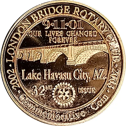 | Obverse lettering | LONDON BRIDGE ROTARY CLUB 2002 2003 9-11-01 OUR LIVES CHANGED FOREVER Lake Havasu City, Arizona 32nd ISSUE ROTARY INTERNATIONAL COMMEMORATIVE COIN |
