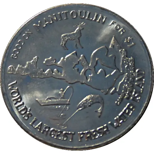 | Obverse lettering | GOOD ON MANITOULIN FOR $1 CANADA`S ONLY UNCEDED INDIAN RESERVE WORLD`S LARGEST FRESH WATER ISLAND |