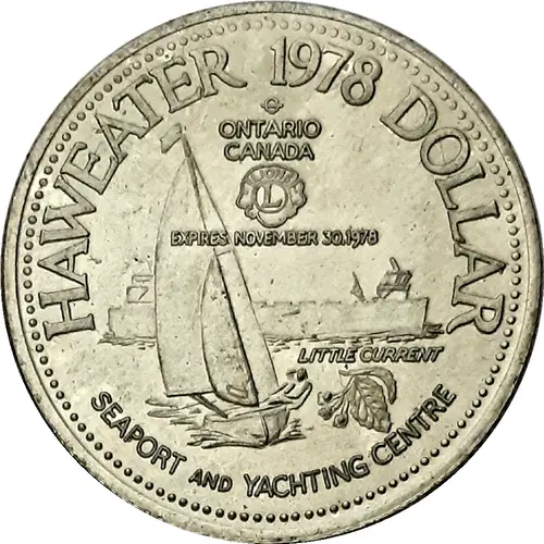 | Obverse lettering | HAWEATER 1978 DOLLAR ϴ ONTARIO CANADA EXPIRES NOVEMBER 31, 1978 LITTLE CURRENT SEAPORT AND YACHTING CENTRE |