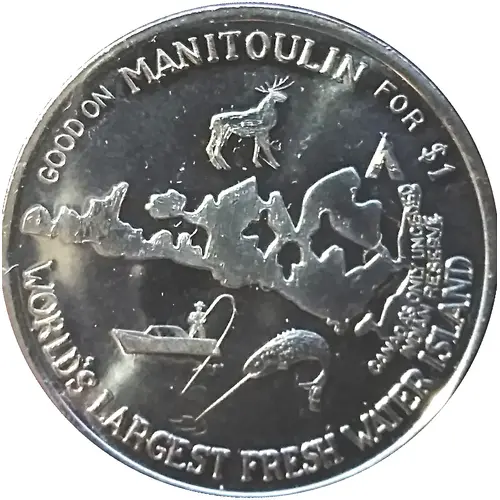 | Reverse lettering | GOOD ON MANITOULIN FOR $1 WORLD`S LARGEST FRESH WATER ISLAND CANADA`S ONLY UNCEDED INDIAN RESERVE |