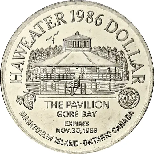 | Obverse lettering | HAWEATER 1986 DOLLAR THE PAVILION GORE BAY EXPIRES NOV. 30, 1986 MANITOULIN ISLAND • ONTARIO CANADA |