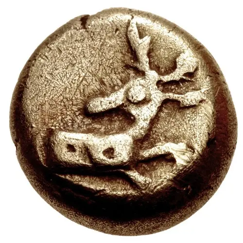 Obverse description Forepart of stag right, head reverted, its dappled coat indicated by indentations on the body