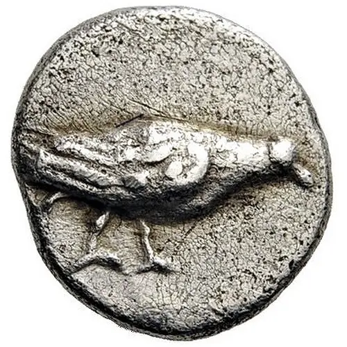 | Obverse description | Dove standing right with closed wings, its head lowered |
