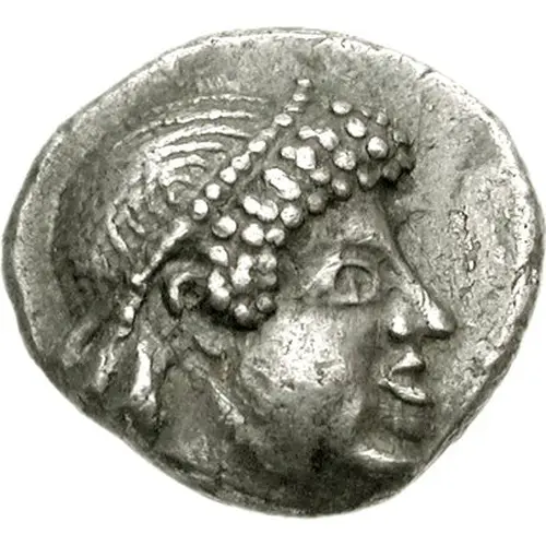 Описание аверса Head of Hera facing right, wearing a stephane and an earring with her hair in a queue in the back