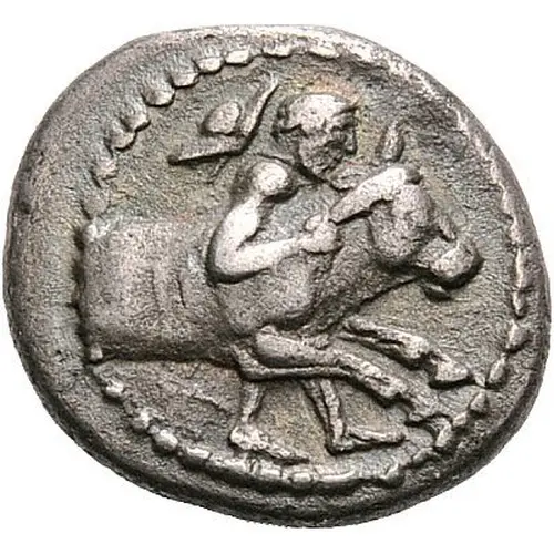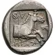 | Obverse description | Thessalos striding right, his petasos hanging from a cord around his neck, holding a band in both his hands around the head of the forepart of a bull moving right |