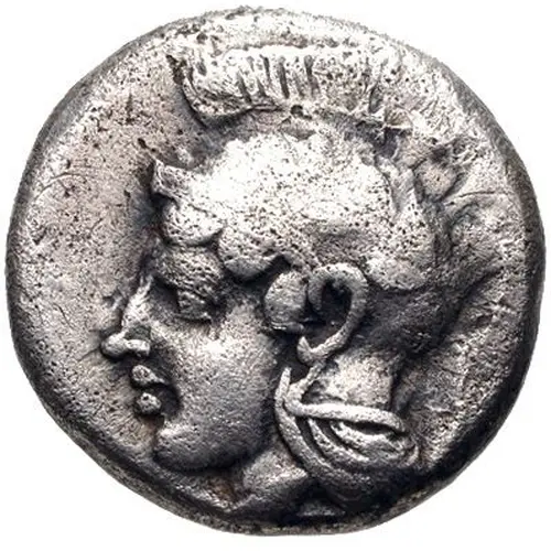 Mô tả mặt trước Head of Athena left with Attic helmet, decorated with laurel wreath.