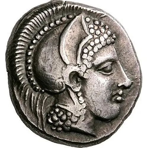 توضیحات روی سکه Head of Athena to right, wearing simple earring and crested Attic helmet with raised cheek pieces