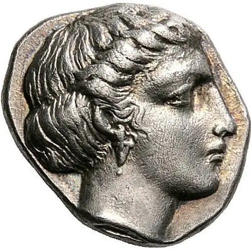 | Obverse description | Head of the nymph Larissa to right, wearing a single-pendent earring and with her hair rolled and bound with a thin ribbon |