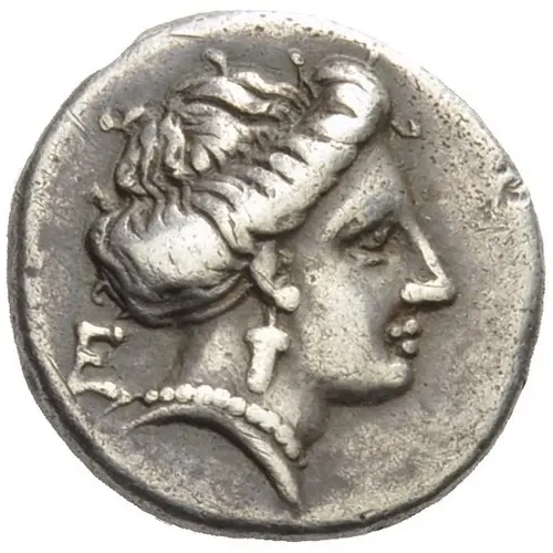 Obverse description Head of the nymph Euboia to right, her hair rolled into a bun at the back of her head, wearing an earring in the form of a bunch of grapes and a pearl necklace. Behind head, Ε.