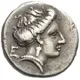 Obverse description Head of the nymph Euboia to right, her hair rolled into a bun at the back of her head, wearing an earring in the form of a bunch of grapes and a pearl necklace. Behind head, Ε.