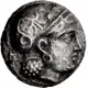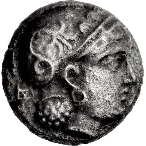 | Aversbeschreibung | Helmeted head of Athena right, monogram or lettering behind. |