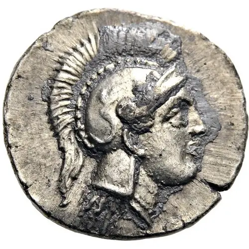 | Aversbeschreibung | Head of Athena to right, wearing a crested Attic helmet adorned with two olive leaves on the visor and a palmette on a tendril on the bowl |