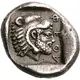 | Reverse description | Head of bearded Herakles to right, wearing lion’s skin headdress and all within incuse square |