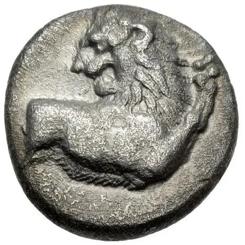 | Descrição do anverso | Forepart of a lion right, head turned back to left. |