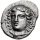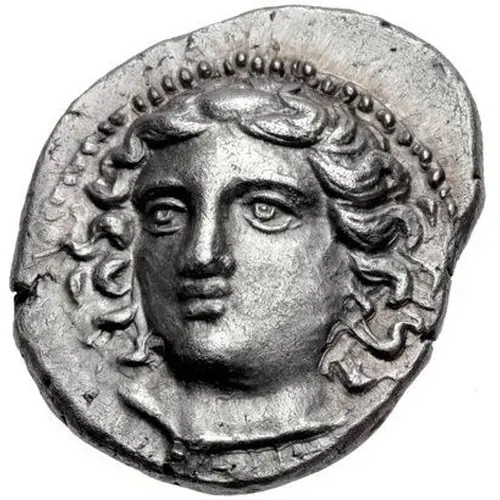 | Obverse description | Head of the nymph Gyrtone facing slightly left, hair in ampyx |