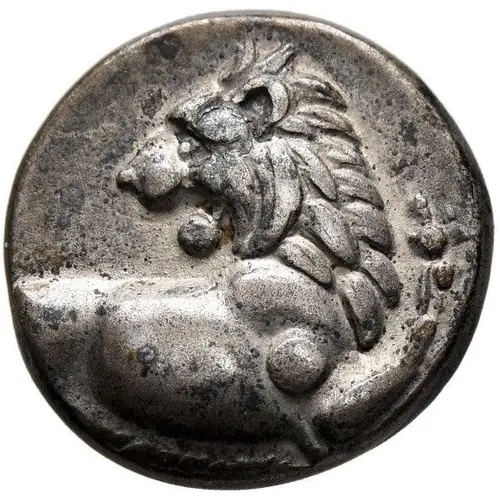 | Obverse description | Forepart of a lion right, head turned back to left. |