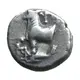 表面の説明 Forepart of bull, left, standing on dolphin Monogram above