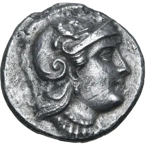 | Descrizione del dritto | Head of Athena to right, wearing crested Attic helmet decorated with griffin. |