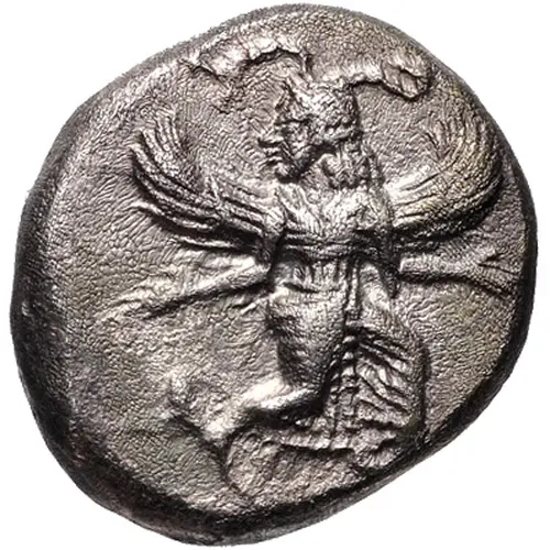 Obverse description Winged female figure in a kneeling-running stance facing right and head facing left